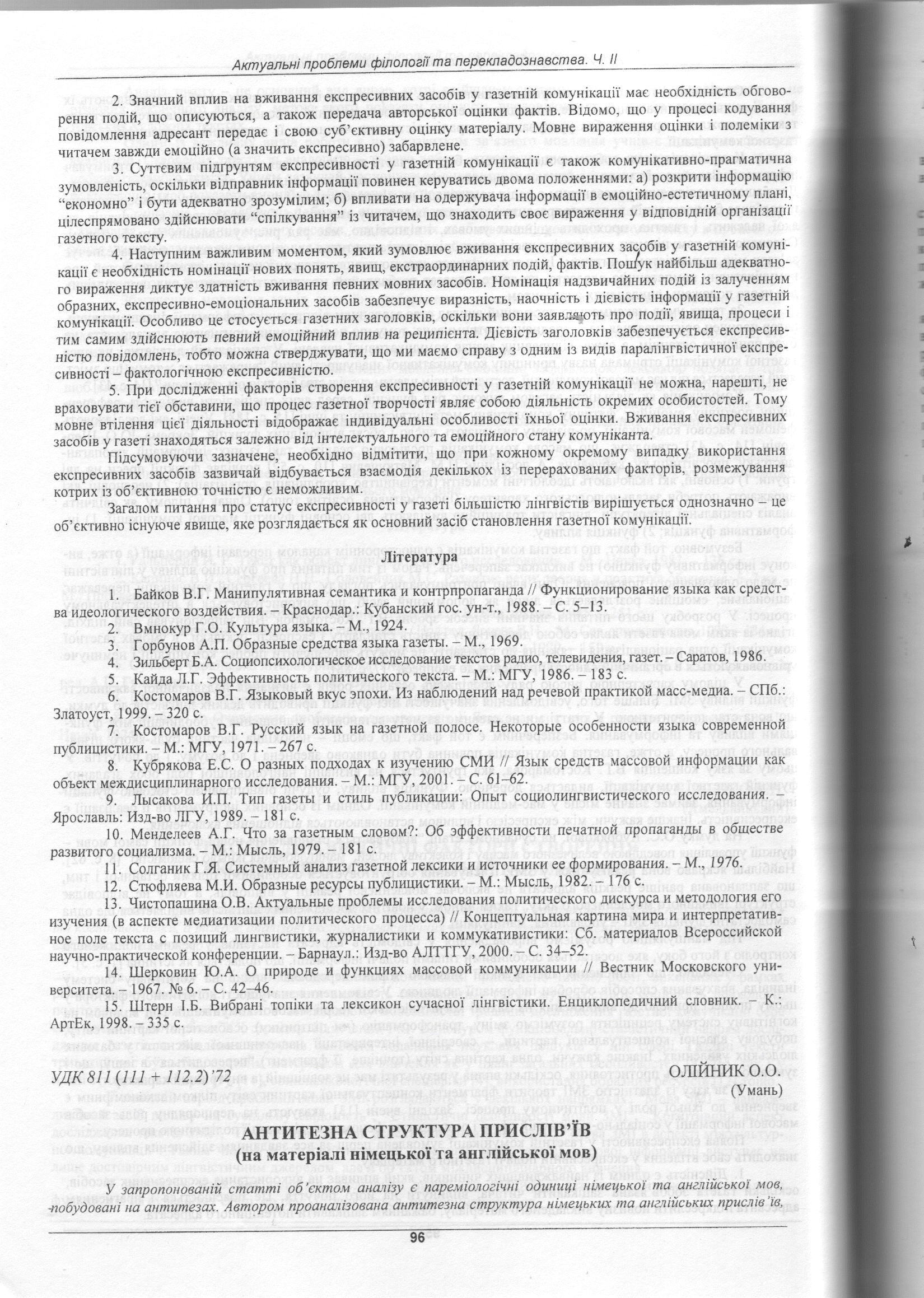 Олійник О.О. Антитезна структура прислів'їв (на матеріалі німецької та англійської мов) / О. О. Олійник // Актуальні проблеми філології та перекладознавства: Зб. наук. праць. – Хмельницький: ХНУ, 2007. – Ч. ІІ: Вип. 3. – С. 96 – 99.