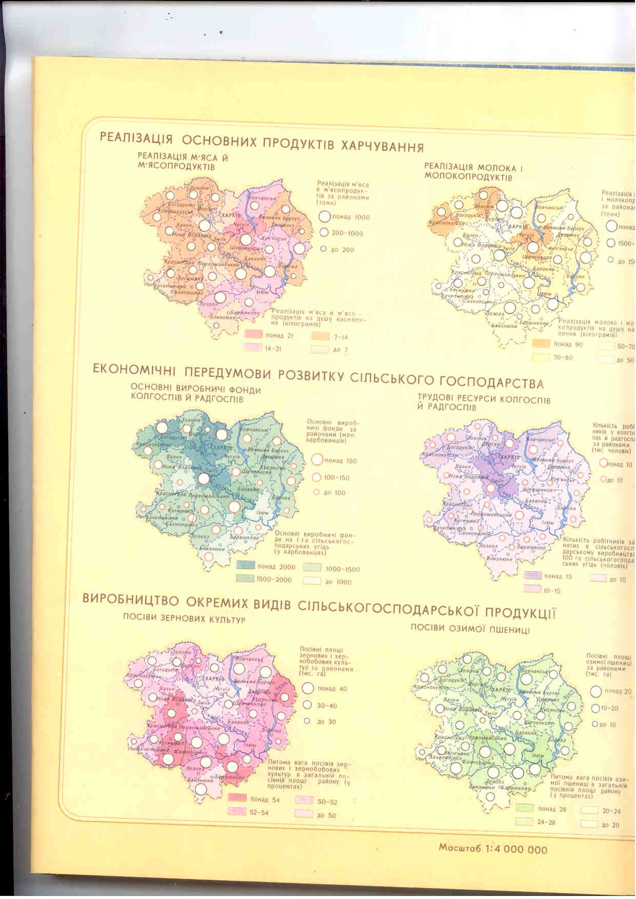 В серіі карт у образно-знаковій формі показані головні показники реалізації продуктів харчування у розрізі адміністративних районів Харківської області.