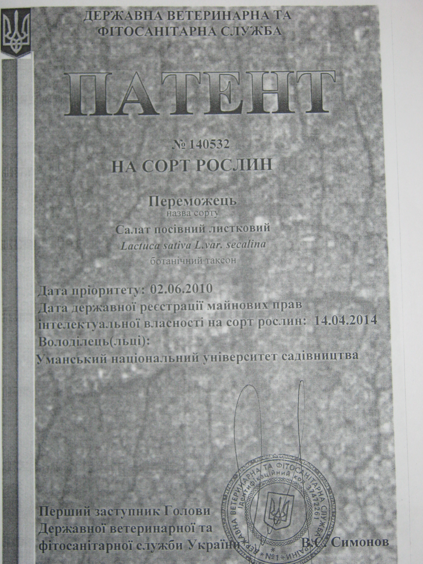 Патент № 140532 на сорт рослин. Салат посівний листковий. Сорт Переможець.