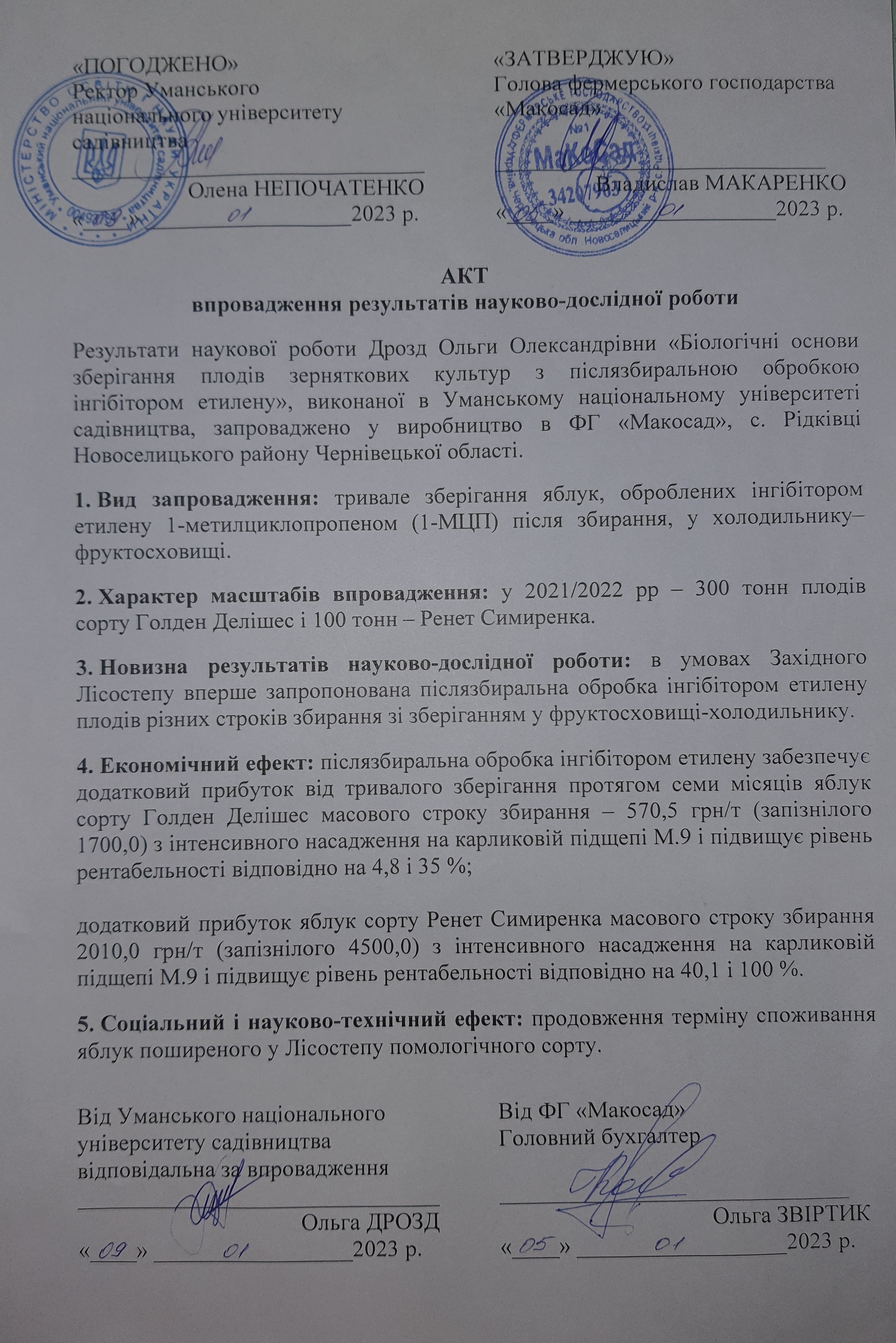 Акт впровадження результатів науково-дослідної роботи в ФГ Макосад
