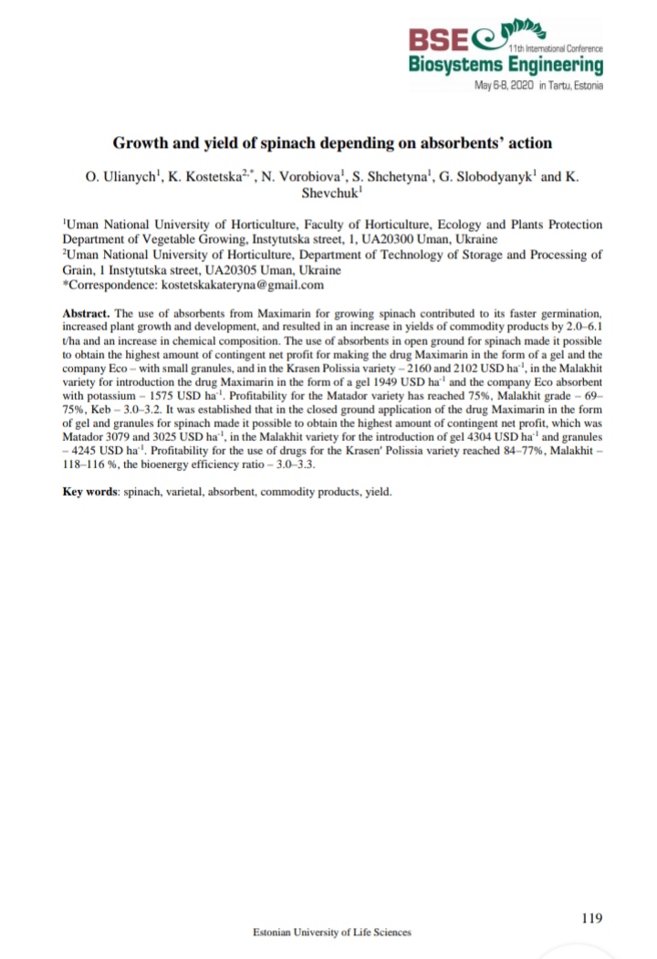 Ulianych O., Kostetska K., Vorobiova N., Shchetyna S., Slobodyanyk G., Shevchuk K. Growth and yield of spinach depending on absorbents’ action: 11th international conference Biosystems Engineering 2020. Estonian University of Life Sciences, Tartu, Estonian. Pp. 119.