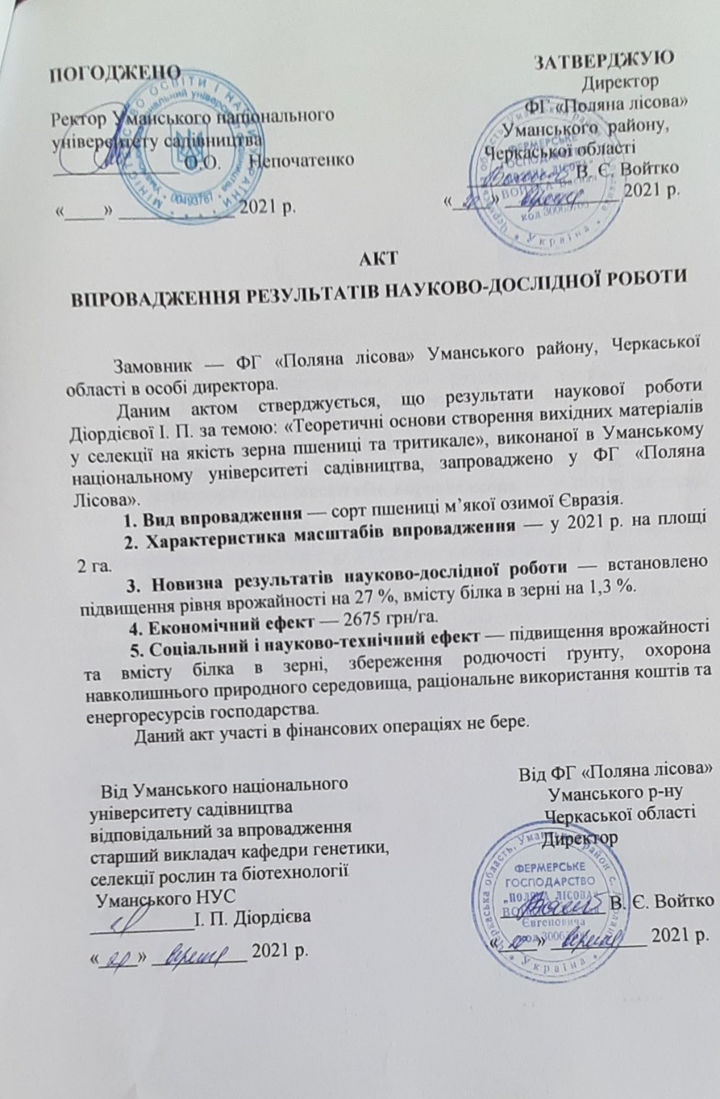 Діордієва І. П. Апробація сорту пшениці мʼякої озимої Євразія. ФГ "Поляна лісова", 2021.