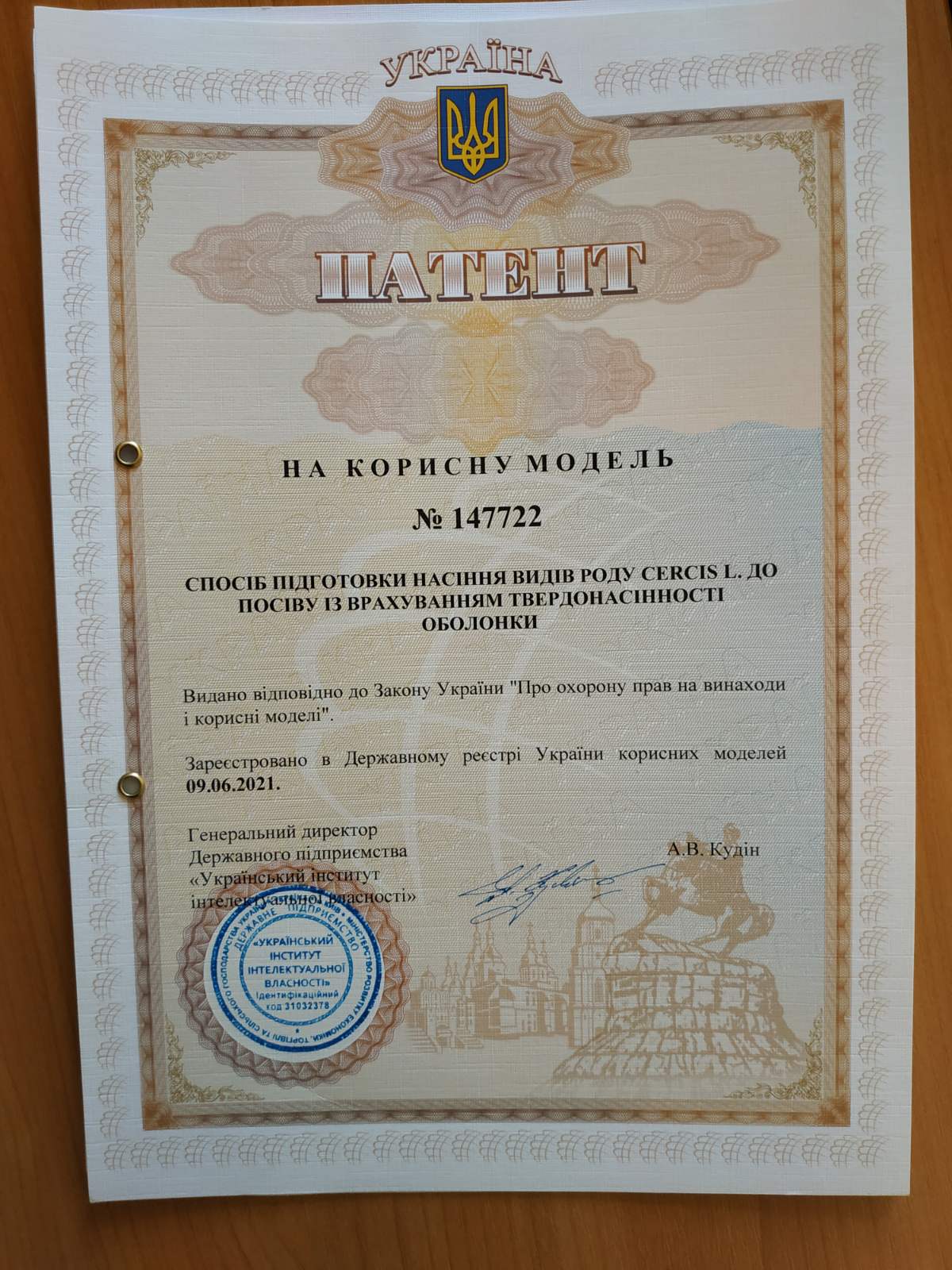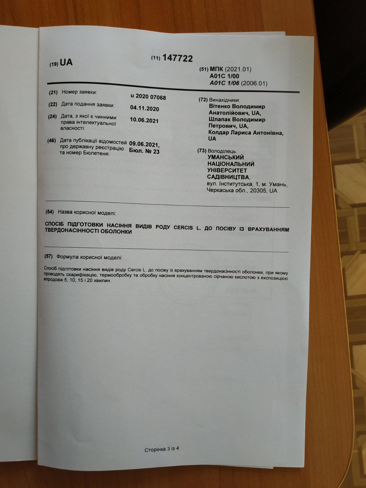 Патент на корисну модель № 147722 Україна, Спосіб підготовки насіння видів роду Cercis L. до посіву із врахуванням твердонасінності оболонки. В. А. Вітенко, В. П. Шлапак, Л. А. Колдар (Україна). Заяв. 04.11. 2020; Опубл. 09.06. 2021, Бюл. № 23.